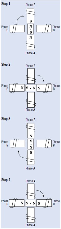 Figure 1 illustrates a typical step sequence for a two phase motor. In Step 1 phase A of a two phase stator is energized. This magnetically locks the rotor in the position shown, since unlike poles attract. In step 2, phase A is turned off and phase B is turned on. The rotor rotates 90° clockwise. In Step 3, phase B is turned off and phase A is turned on but with the polarity reversed from Step 1. This causes another 90° rotation. In Step 4, phase A is turned off and phase B is turned on, with polarity reversed from Step 2. Repeating this sequence causes the rotor to rotate clockwise in 90° steps. See Figure 2 for an electrical representation of the current flow in the two phases.