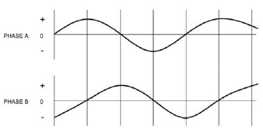 There is an electronic drive that sends the electrical pulses to the two phases at the appropriate time to create rotation. In this example, the rotation is 90° per pulse or step. In practice, the motors have more poles to create smaller step angles such as 15°, 7.5° or 1.8° per step. The term stepping motor traditionally refers to a motor that runs from pulses from an electron drive. By sending the motor a specific number of pulses, you would know the rotor position at any time. The movement created by each pulse is precise and repeatable, which is why stepper motors are so effective for positioning applications. However, all motors are really “stepping motors”. The only difference is the size of the step angle and how the switching of the pulses is created. Many AC motors can be run as stepping motors. The two phase alternating current 90 electrical degrees apart, creates a four step sequence just like the electronic drive except that it is a sine wave instead of a square wave. See Figure 3 below.