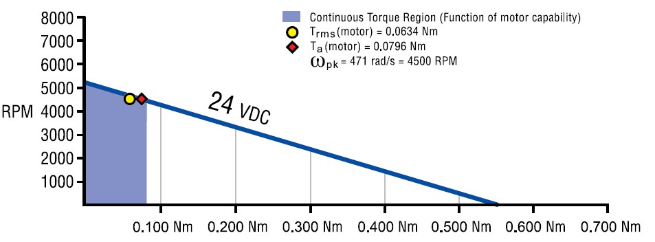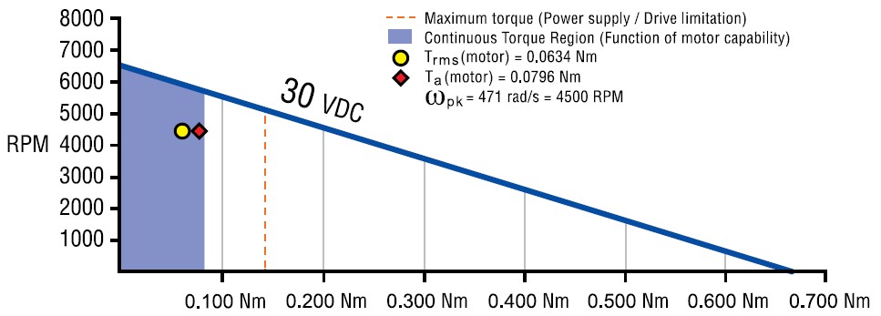 Another item to notice is that the acceleration torque (Ta(motor)) and the RMS torque (Trms(motor)) both lie within the shaded region. It’s critical that the RMS torque remain below the continuous torque rating of 0.0812Nm but in many applications, the acceleration torque will move outside the boundaries of the continuous torque region. This is perfectly acceptable because the acceleration torque is a component of the RMS torque calculation. In this application, it’s a coincidence that acceleration torque and RMS torque happen to fall within the shaded area, but the point to remember is that it’s absolutely necessary for the RMS torque to fall within the shaded region of the curve, otherwise thermal overloading will occur.