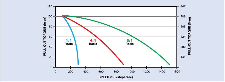 In the example performance graph for a Rotary Stepper Motor (Figure 2) this is shown as the 1:1 voltage ratio curve. As a result the available output torque drops off relatively quickly within a narrow speed range, mainly due to the winding inductance and back-emf of the stepper motor.