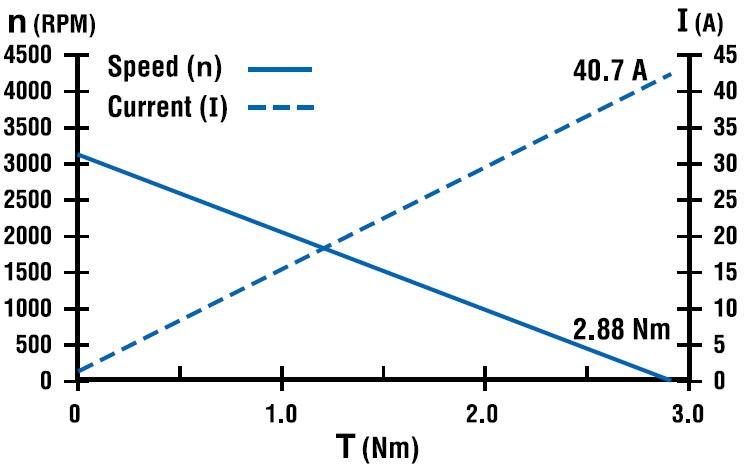 DC motor performance curves can be generated under various conditions. For example, the motor curve illustrated in Figure 1 is representative of an open-loop motor tested rapidly (to prevent heating) on a dynamometer. The test would be done by quickly loading the motor from no-load to locked rotor (stall) using a fixed terminal voltage from a power supply with low output impedance. A test like this is done in order to get a “baseline” measure of motor performance while the motor is at room temperature. Motor shaft speed and current are plotted as a function of motor torque. From this test and a few resistance readings, the torque constant, voltage constant, and terminal resistance values can be determined. This information is very useful to ballpark basic motor performance and can be sufficient for an application that requires intermittent operation with a long rest period between each duty cycle.