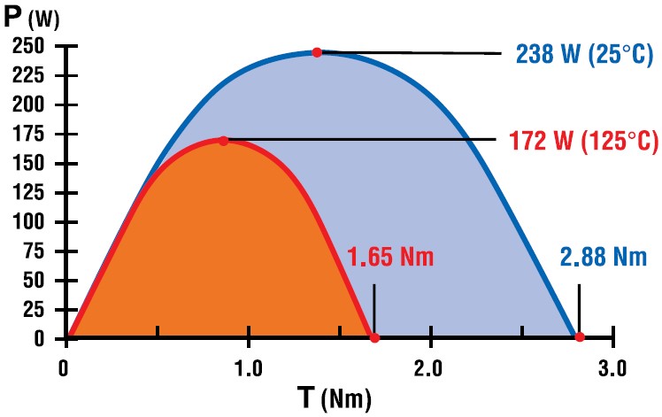 The maximum power at the elevated temperature is approximately 70% of the maximum power at room temperature. This is a significant change, and it’s a direct consequence of the increased motor resistance. Equation 6c will give results that are within 1 or 2% of the numbers above. This equation is very helpful in rapidly estimating the maximum power capability of any DC motor.