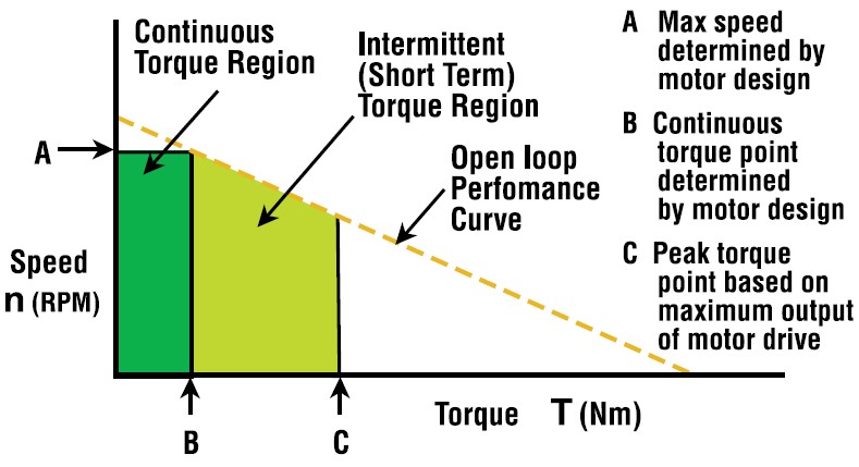 Some manufacturers, in particular those that supply complete servo systems, may present performance curves as a “blend” of information that includes system-level limitations. The limitations considered can include many things such as continuous current capability, peak current capability, drive/amplifier power limitations, maximum dc bus voltage, maximum motor temperature ratings, motor saturation, and mechanical speed limitations. Many manufacturers may illustrate motor torque on the “Y” axis and speed on the “X” axis. The example curves in Figures 7a and 7b illustrate how data might look if factors such as maximum rotational speed, maximum temperature rise, and peak drive current are considered. No matter how the data is published or what other system factors are considered, the motor parameters R