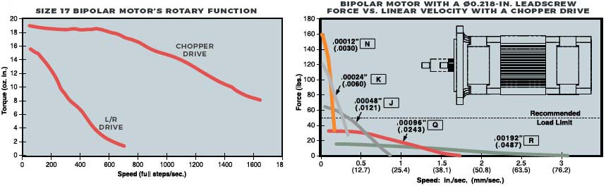 Haydon Kerk can custom manufacture dual-motion actuators to application requirements, and design engineers can set numerous operating parameters during integration … as dual-motion actuators accept controls via standard two-axis stepper-motor drives, chopper drives, and micro-stepping drives. Below is a chart of the capabilities of two Haydon Kerk dual-motion actuator models — the 35000 Series based on a Size 14 hybrid stepper motor and the 43000 Series based on a Size 17 hybrid stepper motor. Note that standard strokes are 1, 2, and 4 in. (25.4, 50.8, and 101.6 mm). Standard motors are Class B rated to 130° C.